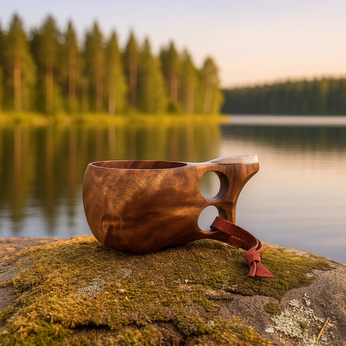 Die Kuksa Kaniini in der dunklen Variante ist eine Hommage an die tief verwurzelten Traditionen Lapplands. Von Hand aus Maserbirke geschnitzt und mit Salzwasser sowie Kaffee behandelt, erhält sie ihre intensiven Brauntöne und ihre natürliche Widerstandskraft.