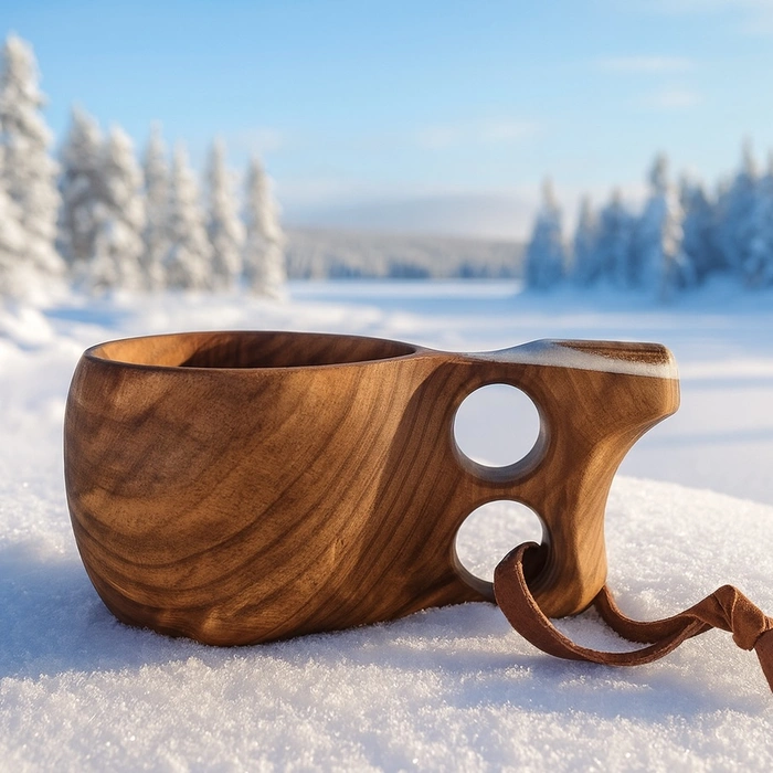 De Kaniini kuksa in donkere uitvoering is een eerbetoon aan de diepgewortelde tradities van Lapland. Handgemaakt uit berkenburl en behandeld met zout water en koffie, met een diepe, warme kleur en stevige structuur.