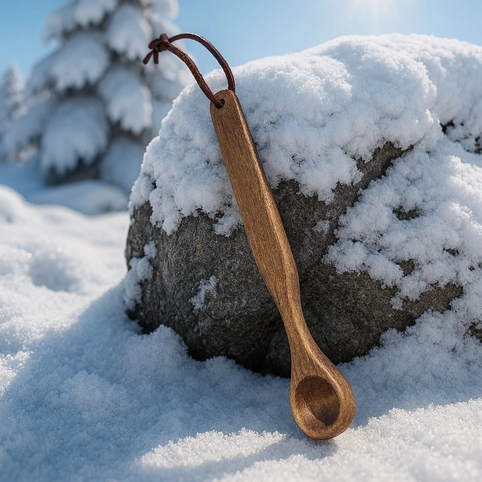 Met het rendierleren koord kun je de lepel gemakkelijk aan het handvat van je kuksa hangen – ideaal voor wandelingen en uitstapjes.